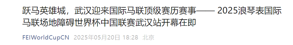 2025浪琴表国际马联场地障碍世界杯中国联赛武汉站为2025浪琴表国际马联场地障碍世界杯中国联赛第二站,将在5月30日至6月2日举行。在媒体通气会现场,中国马术协会副秘书长陈九庆致辞,表示:“浪琴表国际马联场地障碍世界杯作为全球马术运动领域极具权威和深远影响力的官方赛历赛事之一,自1978年创立以来一直吸引着世界各地的顶尖骑手参赛。今天,我们非常荣幸在武汉这座充满活力与魅力的城市,共同开启世界杯中国联赛武汉站的新篇章。”