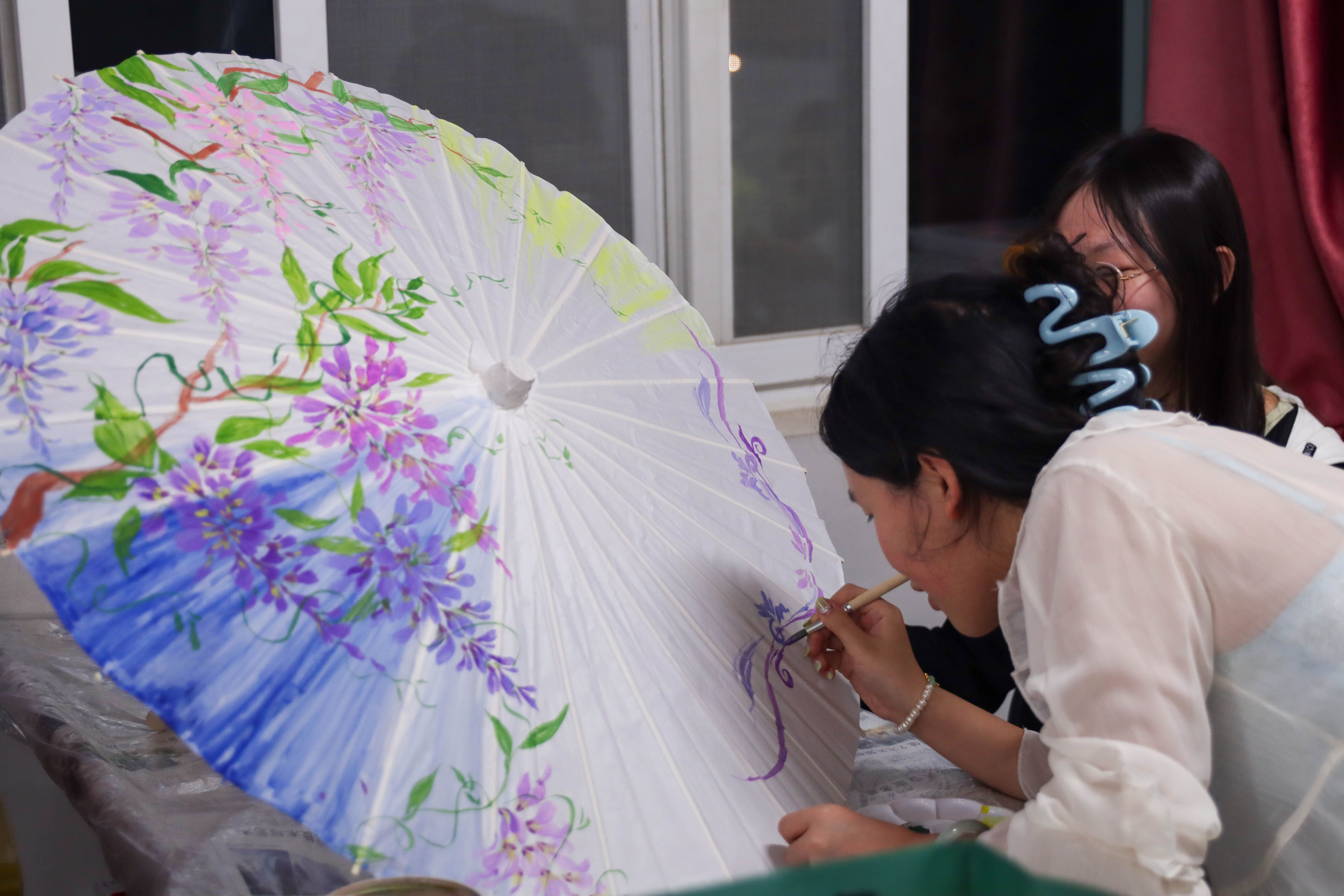 在非遗油纸伞创作区,数十柄素白纸伞如待染的宣纸静候创作。左手稳定伞骨,右手执笔从伞面边缘向内勾勒,笔尖流转间,淡紫色的花瓣便在伞面次第绽放。2023级食品科技学院任羽茜说:“我之前没有学过绘画,握笔时紧张得手心冒汗,害怕自己画不好,后面沉浸其中的时候才明白享受非遗文化的创作过程就好了。”