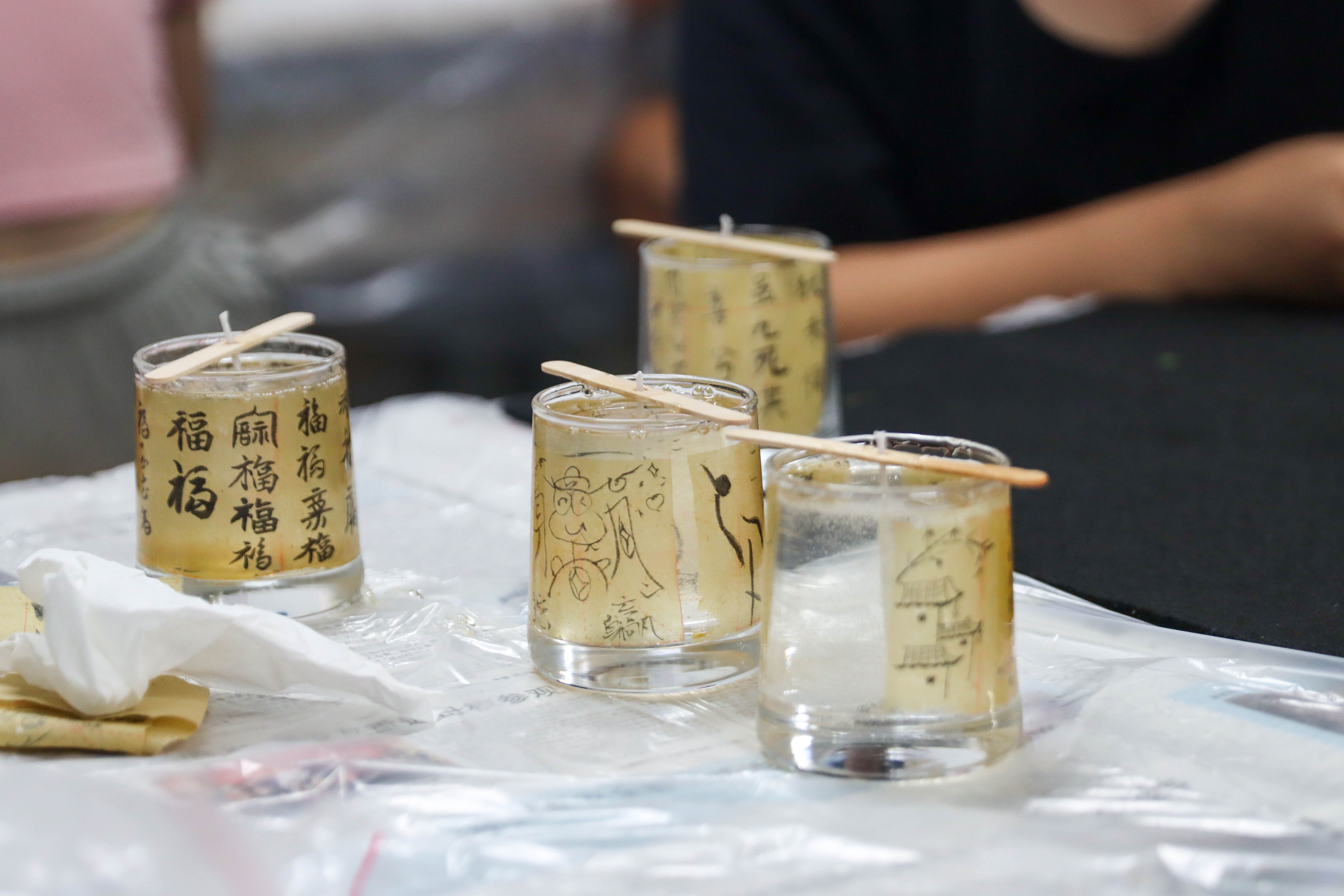 书法蜡烛制作区飘散着淡淡的蜜蜡清香。将宣纸贴于杯壁,缓缓注入68度的液态蜡,2022级国际教育学院李振兴提笔挥毫,墨迹未干的“清风徐来”四字即将嵌入蜡烛杯里。“从高中开始我对书法就很感兴趣,没事就会趴在桌子上写书法字。”李振兴说。
