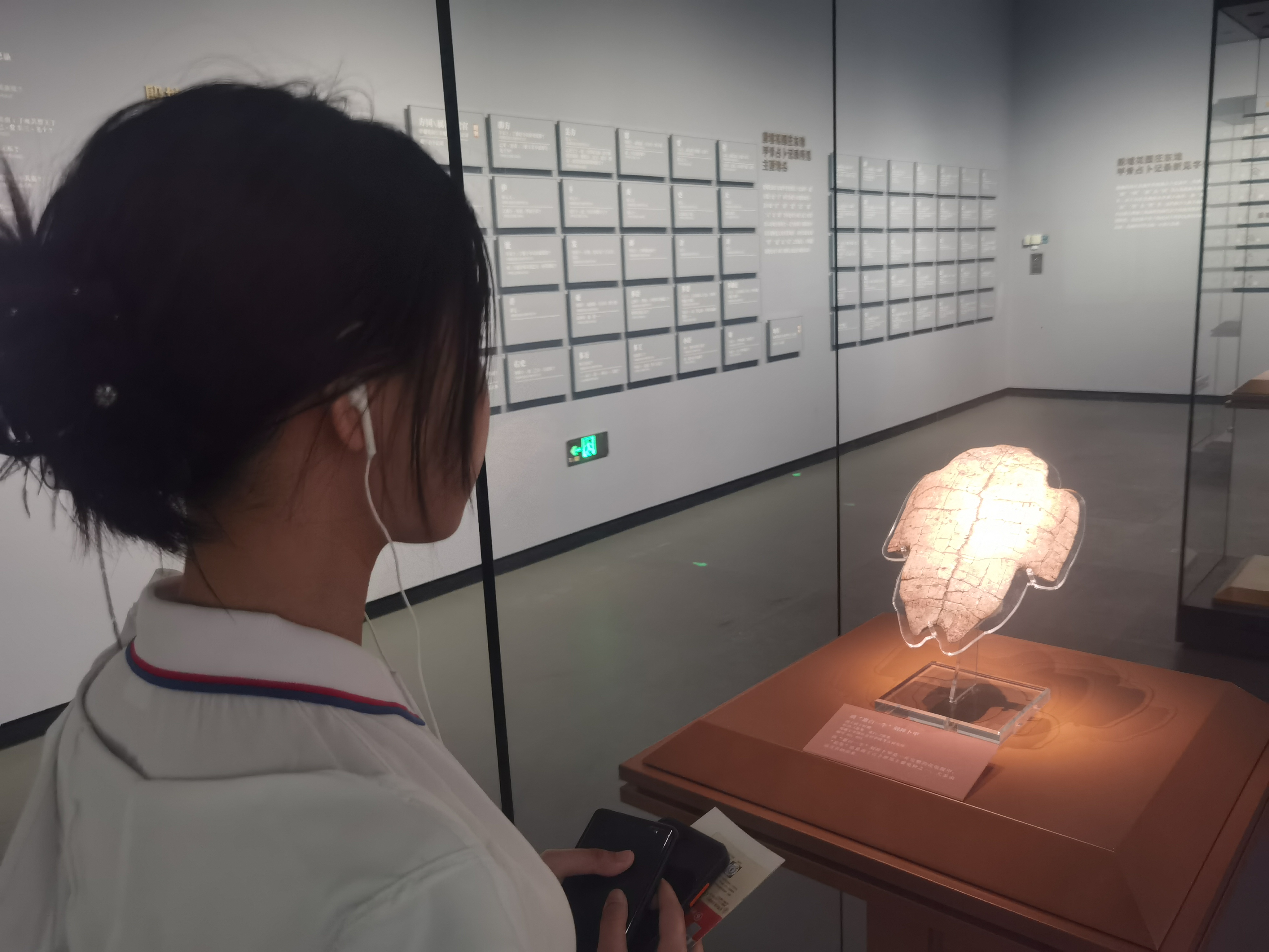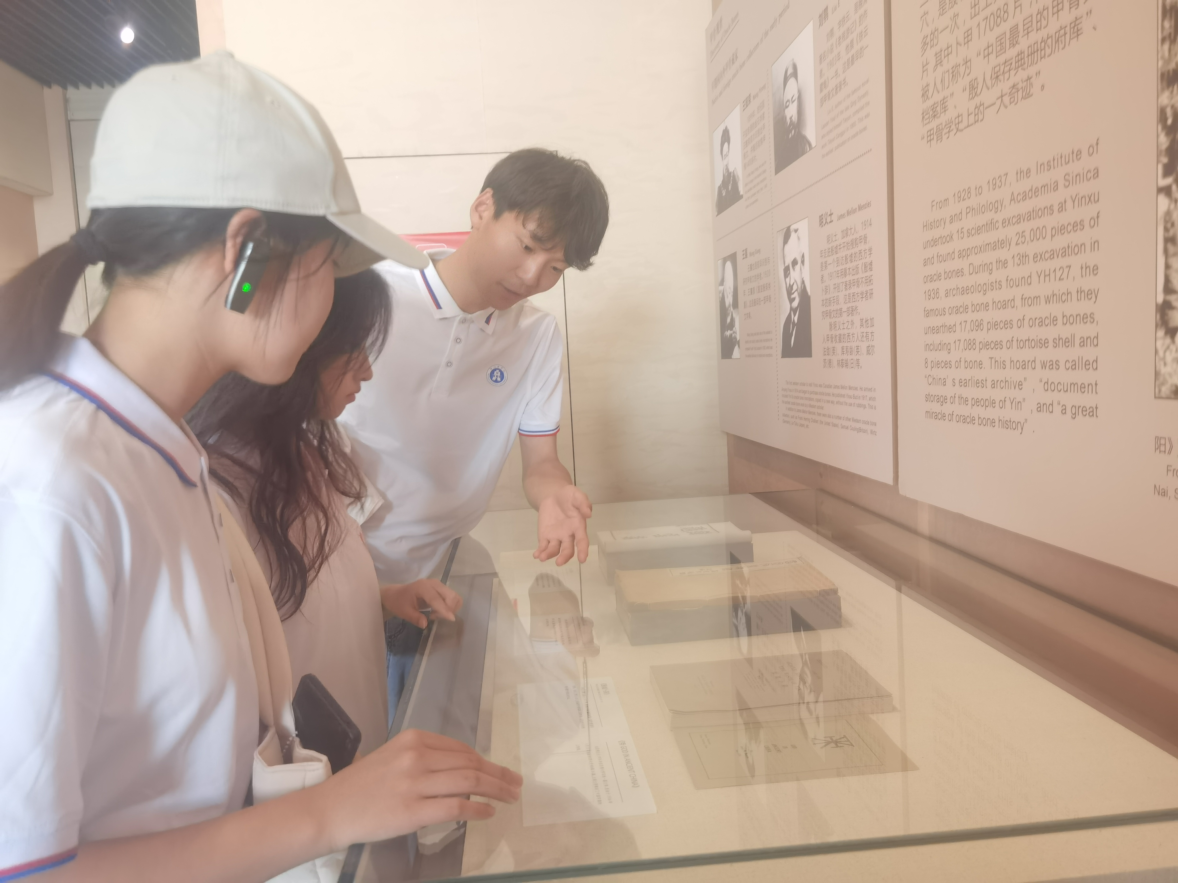 步入殷墟博物馆,队员们还见到了造型奇特瑰丽,纹饰繁缛精美的镇馆之宝——铜手形器。看着展厅里珍贵的文物,实践队员孙晟哲说:“最让我震撼的就是看到那些记录着占卜、祭祀的甲骨,仿佛能窥见三千年前商王对命运的叩问。这次参观,让我深刻感受到中华文明的源远流长与博大精深。”殷墟博物馆是殷墟国家考古遗址公园的核心工程、灵魂工程,拥有4000件套珍贵文物。