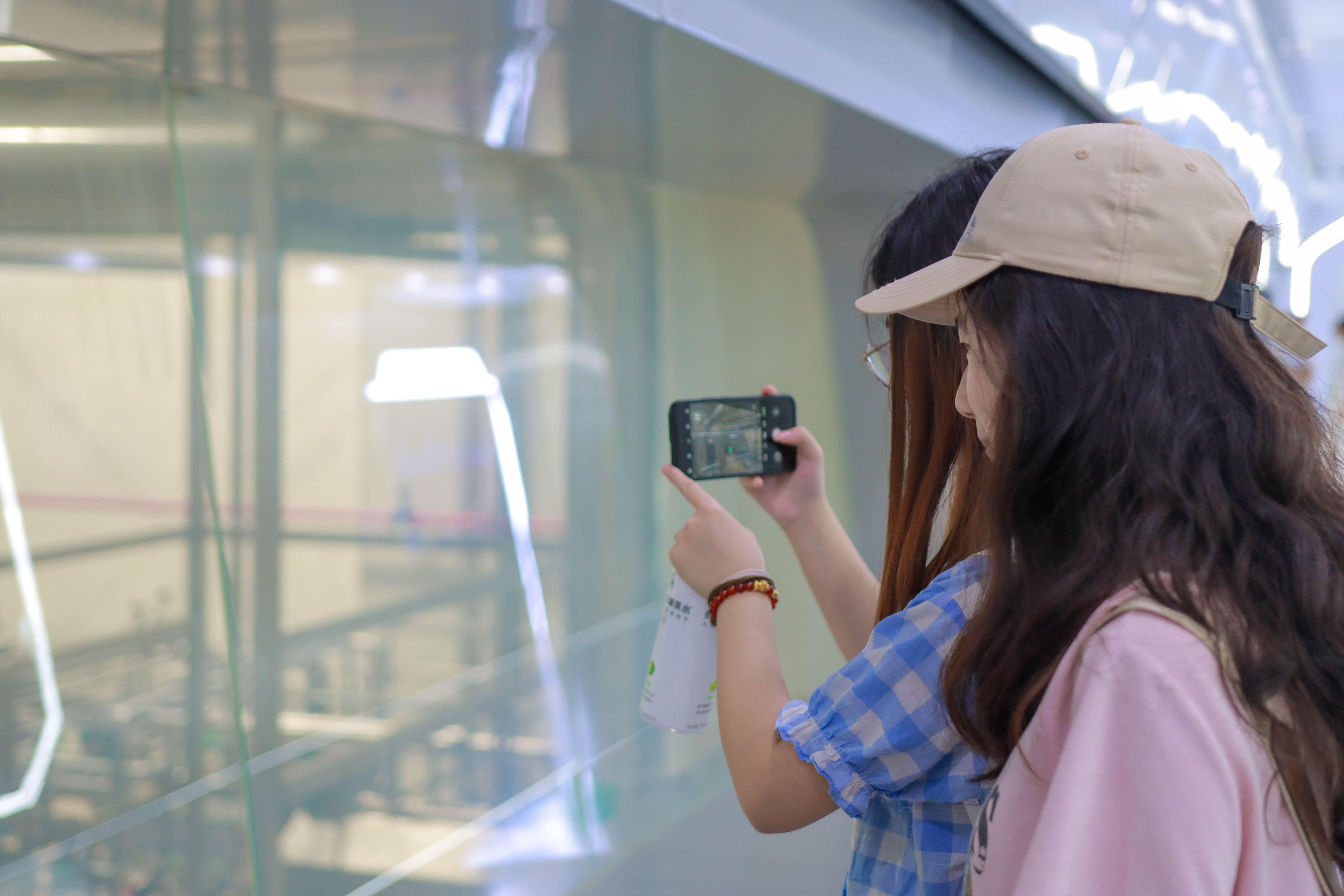 在讲解员党岚新的带领下,师生首先参观低温体验楼展厅,通过图文展板与多媒体演示,深入了解蒙牛品牌发展脉络与企业文化。随后,众人来到生产观摩通道,透过玻璃幕墙近距离观察高度自动化的酸奶生产线。据了解,从鲜奶预处理到成品罐装,全流程密闭运行,仅需4名工作人员在中控室通过系统监控数据,真正实现“无人化生产”。“看不到一滴鲜奶,只有管道与密闭罐在运转,科技感太震撼了!”2024级国际教育学院陈珊说。