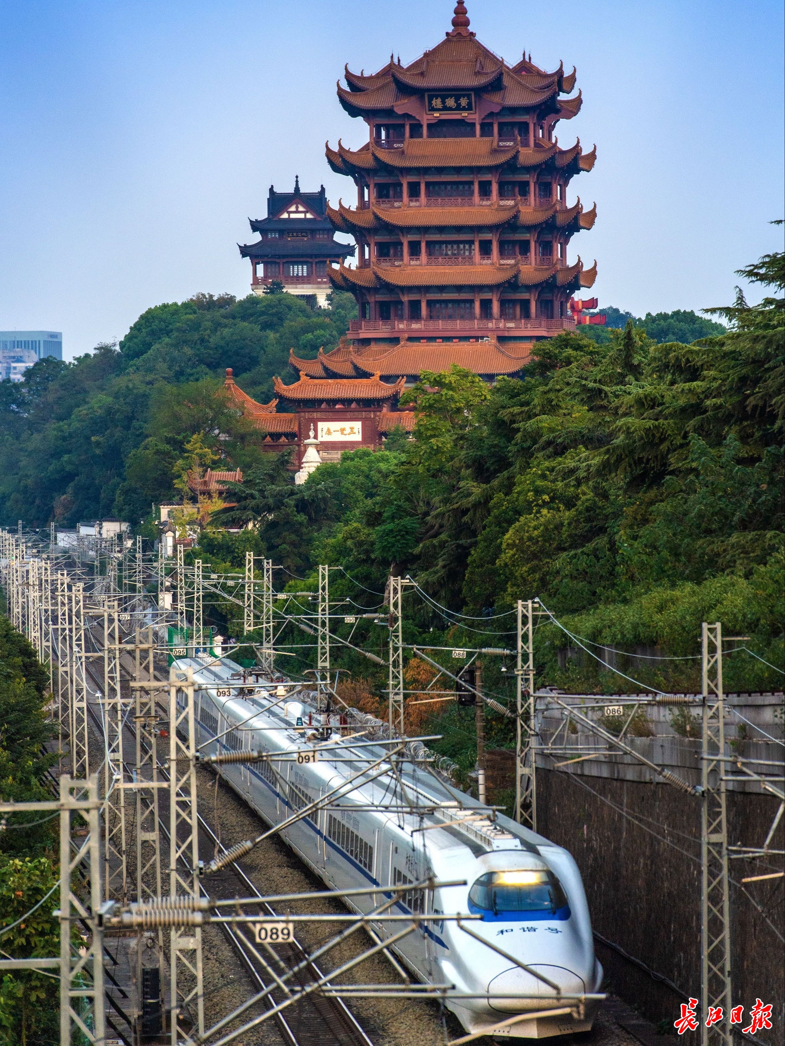 黄鹤楼与“和谐号”动车同框。(长江日报资料图)