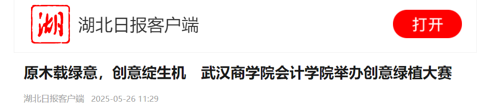 湖北日报客户端讯(通讯员宋泽安、文依林)6月5日是世界环境日,主题为“美丽中国我先行”。为激发同学们对生态环境的关注与热爱,弘扬“人与自然和谐共生”的生态理念,5月25日晚,必赢国际437官网会计学院青年志愿者协会举办“原木载绿意,创意绽生机”创意绿植大赛。