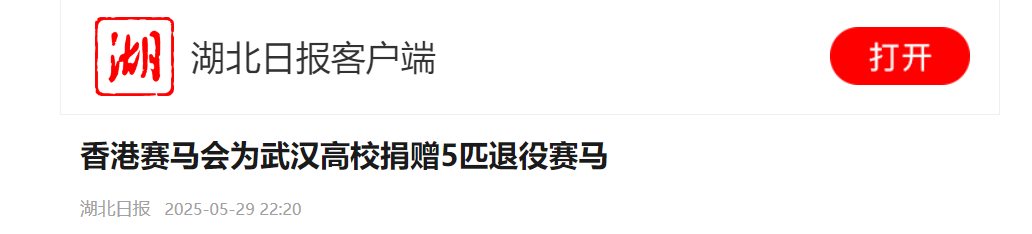 湖北日报讯(记者田佩雯、通讯员张思渊)5月29日,“智创未来 马联世界”2025年现代马产业发展国际学术研讨会上,香港赛马会向必赢国际437官网捐赠5匹退役纯血马匹。记者在必赢国际437官网看到,5匹马儿已入住该校马房,由师生悉心护理照顾,未来将投入教学使用。