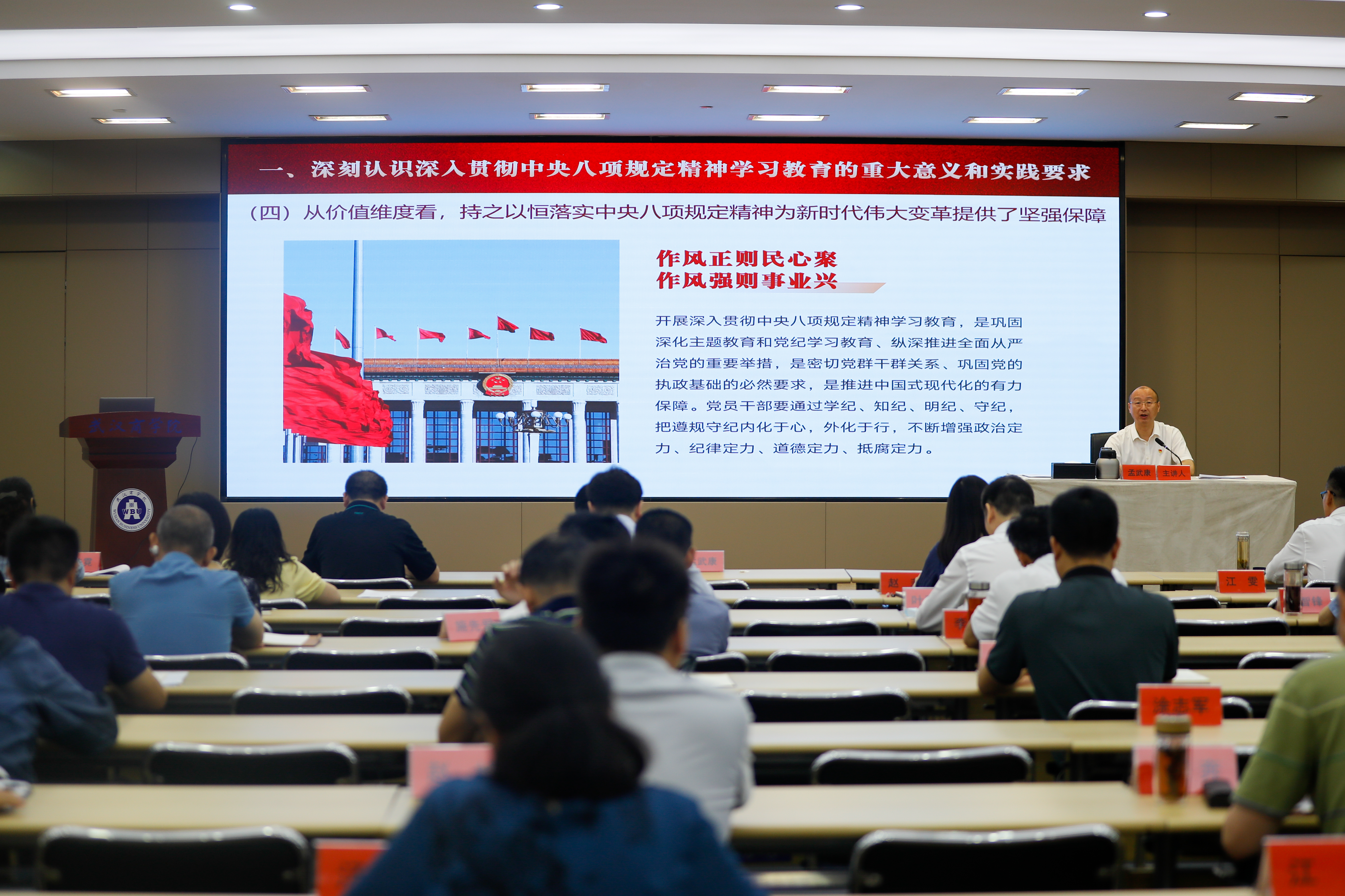 在中国共产党成立104周年到来之际,6月26日上午,校党委理论学习中心组(扩大)学习暨“七一”专题党课举行,专题党课由党委书记孟武康讲授。此次党课聚焦学习习近平总书记关于加强党的作风建设的重要论述,贯彻落实中央八项规定精神,大力弘扬学校在初创阶段形成的优良传统,切实将当年于酱品厂仓库办学时锤炼的过硬作风融入血脉,转化为推动学校高质量发展的强大动力,为奋力谱写必赢国际437官网高质量发展新篇章筑牢作风保障。