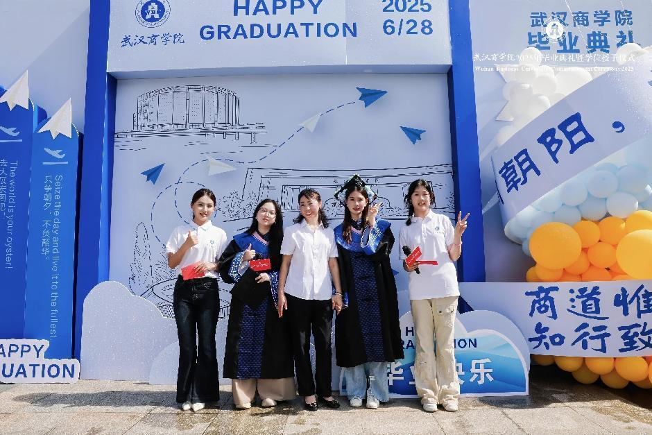 体育馆入口处,30名志愿者在毕业典礼场馆外列队,他们手持“未来可期”“步履不停”等定制手举牌,组成“祝福长廊”。经济学院毕业生储浩然说:“我穿着学士服经过他们,能听到大家为我们欢呼,这份心意,让我们十分感动。”