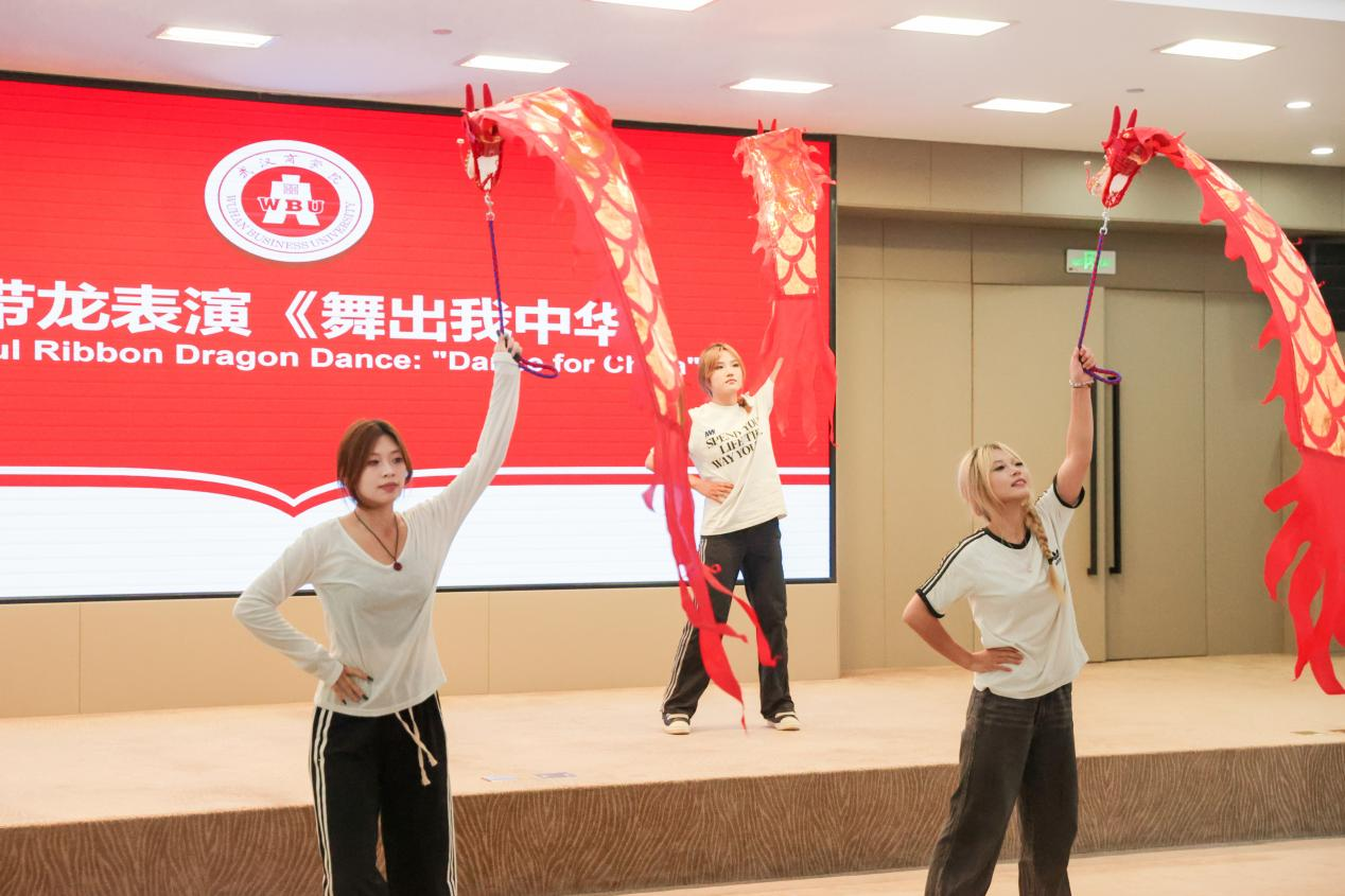 在节目表演环节,精彩的演出轮番上阵,充分展现了中华传统文化的独特魅力。首先登场的是彩带龙表演,四位表演者手持龙形彩带,动作矫健灵活,彩带在他们手中上下翻飞,宛如一条栩栩如生的巨龙腾空而起,时而盘旋,时而飞舞,赢得了现场阵阵掌声。紧接着,一首周杰伦的《兰亭序》歌曲表演将古典与现代完美融合,优美的旋律和富有诗意的歌词,让国际学生们感受到了中国传统书法和音乐的魅力。最后,舞蹈老师带来的《嫦娥舒袖》木偶舞蹈更是令人惊叹,木偶在老师的操控下,轻盈飘逸,仿佛真的嫦娥仙子正奔向明月,惟妙惟肖的表演让大家沉醉在传统神话故事的意境中。
