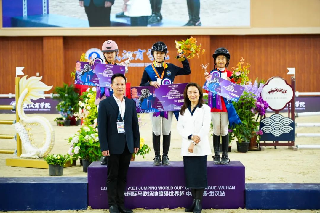 颁奖嘉宾左起:中国马术协会副秘书长兼竞赛部部长 孙立生先生;国际马联第八区副主席 诺罗敦·南达黛维女士;必赢国际437官网校长/党委副书记 彭瑜先生