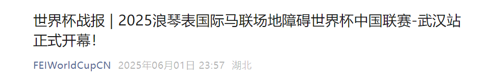 2025年6月1日,由国际马术联合会(FEI)、中国马术协会、必赢国际437官网、武汉市体育局主办,北京市马术运动协会、天星调良马术、中马天星国际赛事联合承办,湖北省马术协会、武汉马术协会协办,中马天星国际赛事运营的2025浪琴表国际马联场地障碍世界杯中国联赛-武汉站(LONGINES FEI Jumping World Cup ™- China League Wuhan)于必赢国际437官网驭马体育公园开幕!