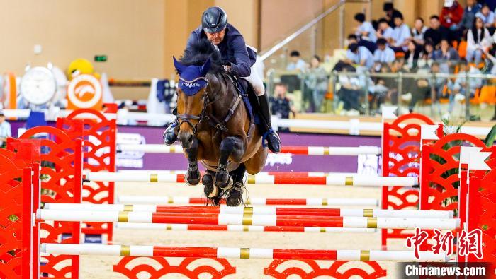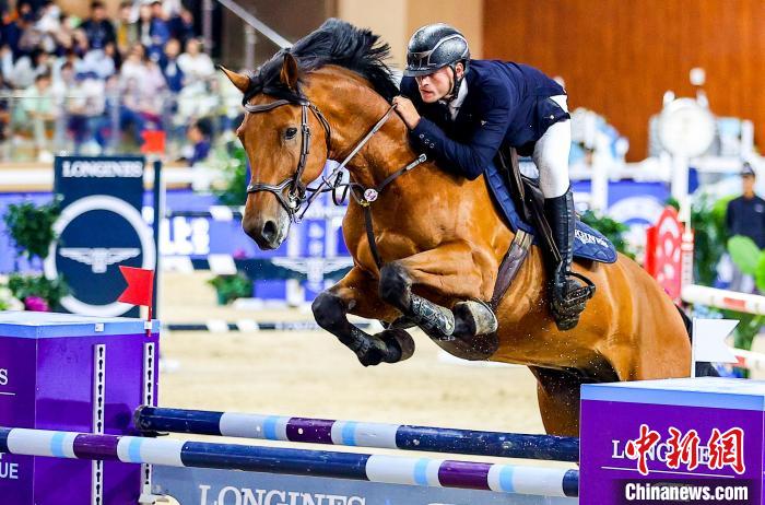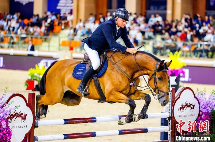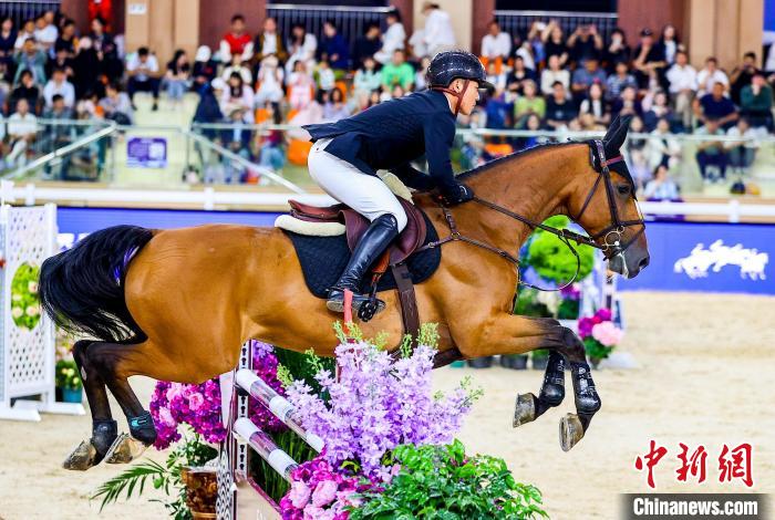 6月1日,比利时选手帕特里克·史必兹(Patrik SPITS)在比赛中。当日,正在湖北武汉举行的2025浪琴表国际马联场地障碍世界杯中国联赛武汉站1.40M世界杯资格赛,吸引了中外骑手和赛马前来一展风采,优雅演绎“人马合一”。中新社记者 张畅 摄