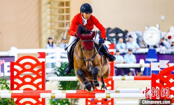 6月1日,中国选手杨华(Hua YANG)在比赛中。当日,正在湖北武汉举行的2025浪琴表国际马联场地障碍世界杯中国联赛武汉站1.40M世界杯资格赛,吸引了中外骑手和赛马前来一展风采,优雅演绎“人马合一”。中新社记者 张畅 摄