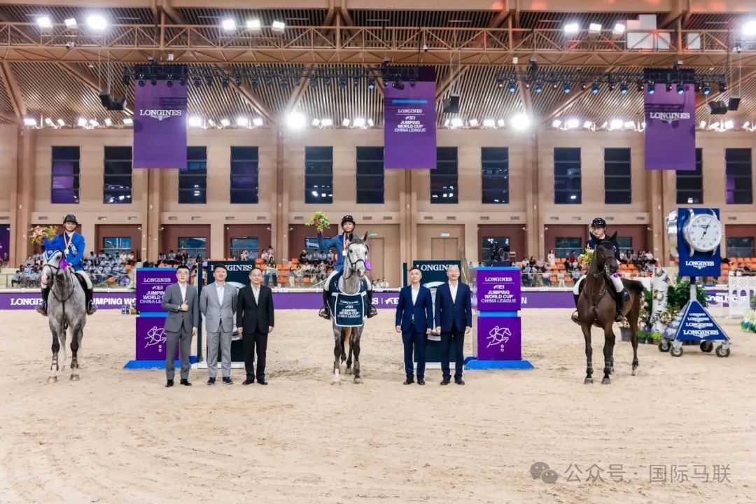 在1.40M浪琴表国际马联世界杯资格赛上,经过激烈比拼,三位中国骑手取得佳绩:14岁的孙瑞睿策骑马匹布丁获得冠军;姜志祥策骑马匹小V获得亚军;段义华策骑马匹苜蓿获得季军。国际马联副主席、国际马联第八区主席黄启芳,中国马术协会秘书长钟国伟,北京市马术运动协会主席刘诗来与浪琴表中国区副总裁解琦为获奖骑手颁奖。