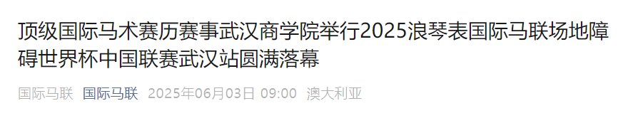 2025浪琴表国际马联场地障碍世界杯中国联赛武汉站是一场融入了马术竞技、时尚生活与公益文化的嘉年华活动,它以马术赛事为主体,延展出多样的消费场景,为武汉文旅消费带来空间。这也将助力武汉打造“国际赛事之都,体育消费之城”!