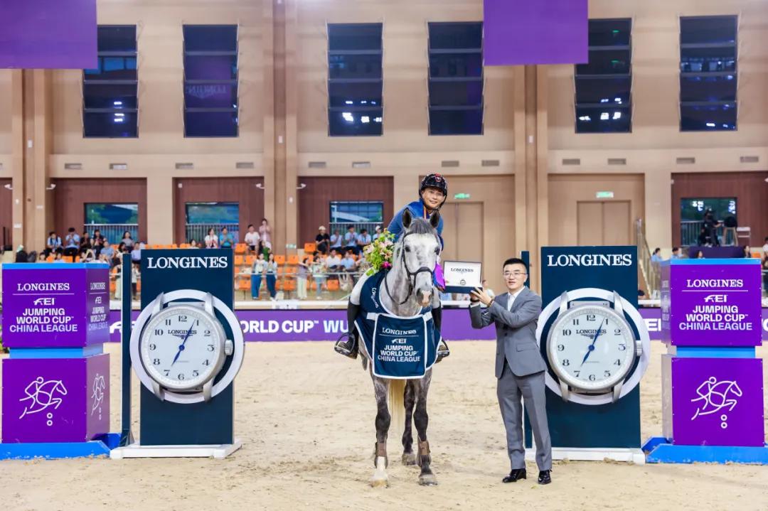 在1.40M浪琴表国际马联世界杯资格赛上,经过激烈比拼,三位中国骑手取得佳绩:14岁的孙瑞睿策骑马匹布丁获得冠军;姜志祥策骑马匹小V获得亚军;段义华策骑马匹苜蓿获得季军。国际马联副主席、国际马联第八区主席黄启芳,中国马术协会秘书长钟国伟,北京市马术运动协会主席刘诗来与浪琴表中国区副总裁解琦为获奖骑手颁奖。