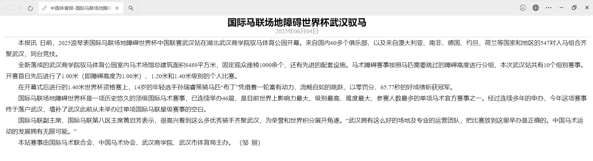 中国体育报:国际马联场地障碍赛世界杯武汉驭马