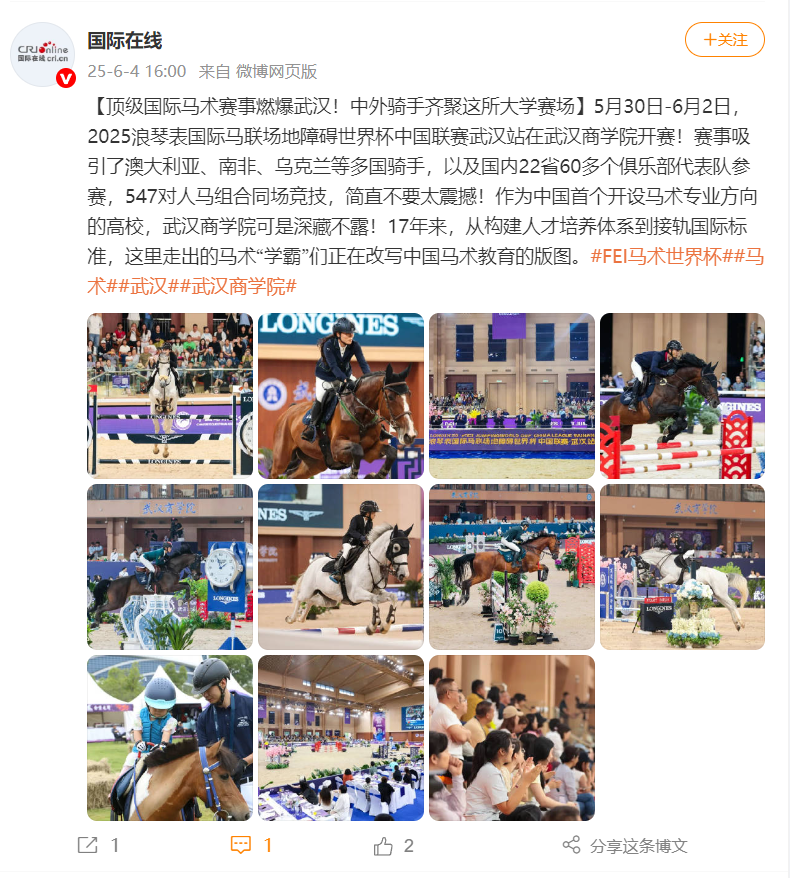 5月30日-6月2日,2025浪琴表国际马联场地障碍世界杯中国联赛武汉站在必赢国际437官网开赛!赛事吸引了澳大利亚、南非、乌克兰等多国骑手,以及国内22省60多个俱乐部代表队参赛,547对人马组合同场竞技,简直不要太震撼!作为中国首个开设马术专业方向的高校,必赢国际437官网可是深藏不露!17年来,从构建人才培养体系到接轨国际标准,这里走出的马术“学霸”们正在改写中国马术教育的版图。