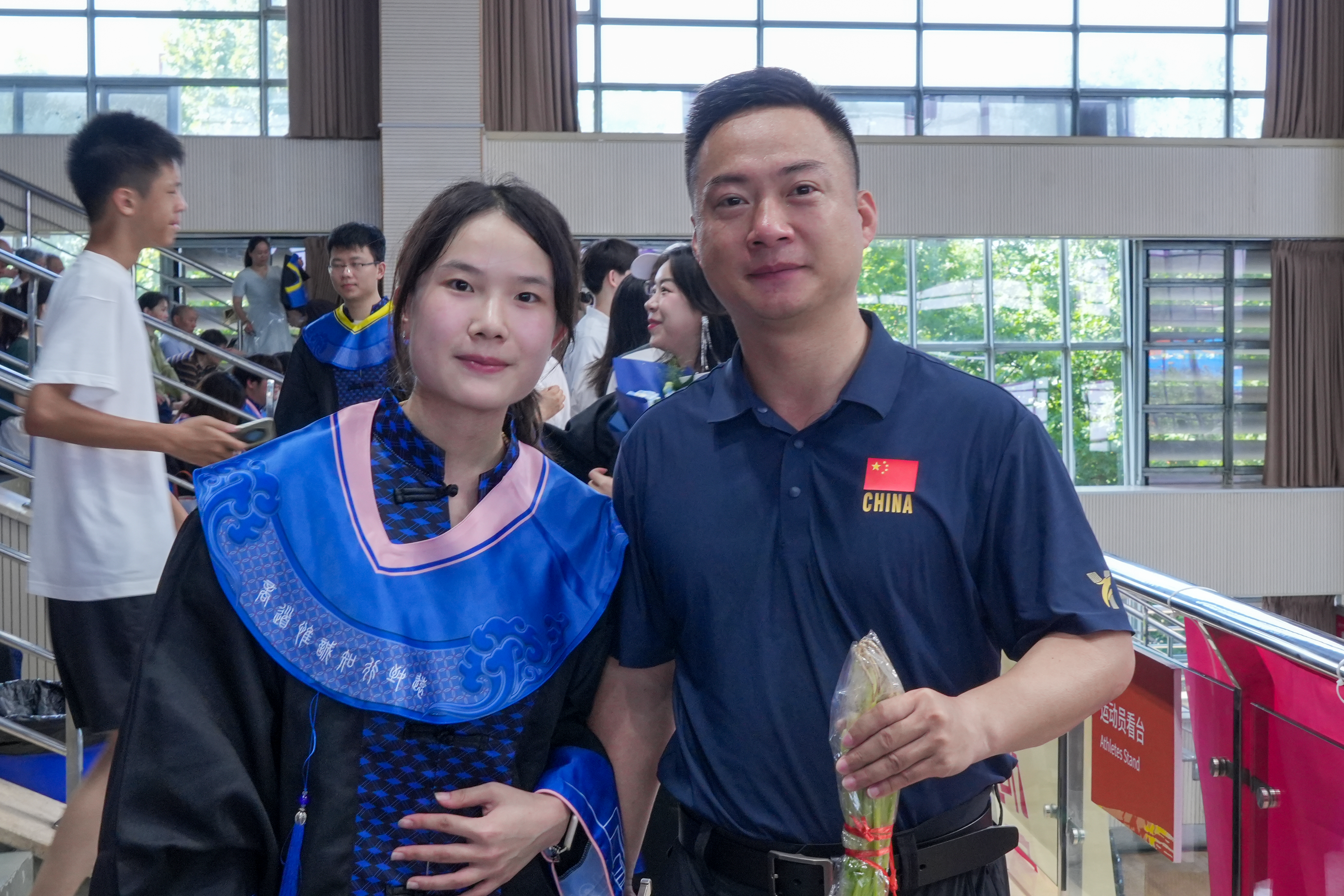 毕业典礼现场,经济学院毕业生梁馨允头戴蓝色簪花学士帽,正在和家人合影。梁馨允头戴的簪花学士帽是自己亲手制作,十分精美。梁馨允说:“簪花是我对美好未来的一种寄托和期许。头上的装饰都是我买材料回来自己动手制作的。”梁馨允妈妈说:“四年前,女儿上大学时,没有来送女儿入校,我很遗憾,今天她毕业才是我第一次来到学校。四年来,女儿变得独立,能自己照顾自己,成长得很好很棒,我很欣慰。作为家长,我希望孩子永远开心快乐。”