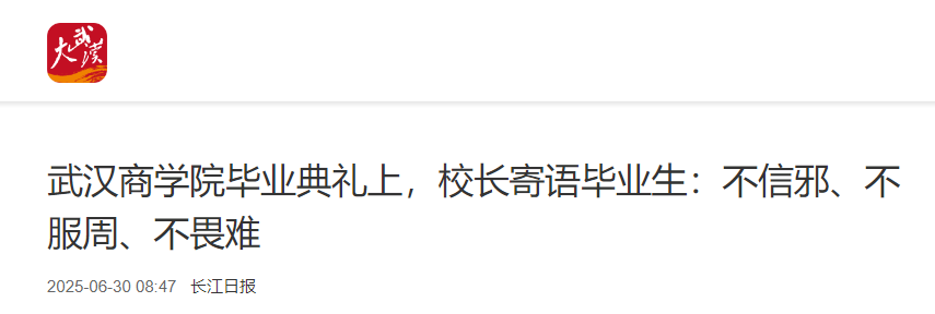 “总以为毕业遥遥无期,今天3294名同学从后官湖畔整装待发,奔赴美好前程。”校长彭瑜深情寄语毕业生:“武汉这座英雄城市通过大江大河的浸润,经年累月的沉淀,逐渐形成了不信邪、不服周、不畏难的英雄意志,犹如三把钥匙,为同学们开启了通往未来无限可能的想象之门。”彭瑜表示,希望毕业生们带好这三把钥匙,有追寻破除认知茧房的创新魄力、追寻超越竞争逻辑的格局重塑、追寻穿越风暴眼的韧性生长,勇闯未知领域、敢于试错求证,奔赴步履生光的人生新征程。