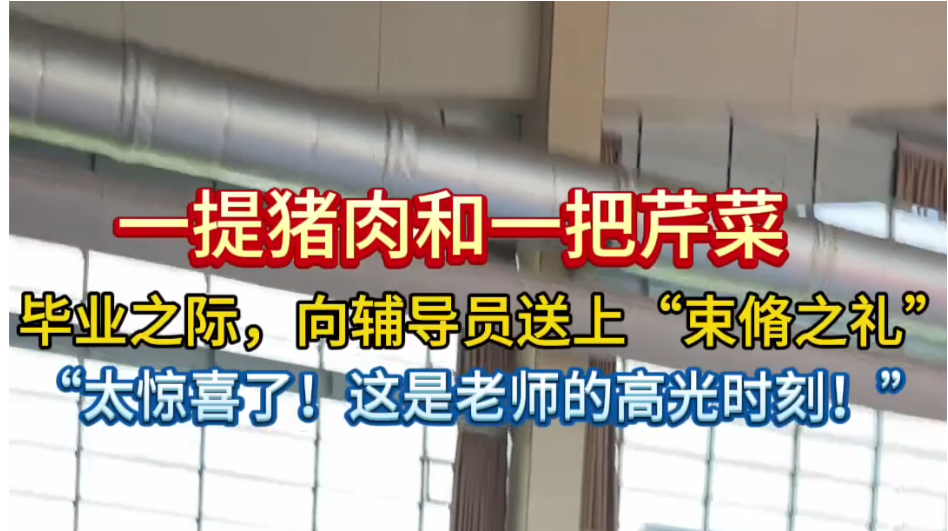 2021级休闲体育何冰迪在现场为辅导员周敦峰送上“束脩之礼”:一提猪肉和一把芹菜,并恭敬地向周敦峰拱手鞠躬。