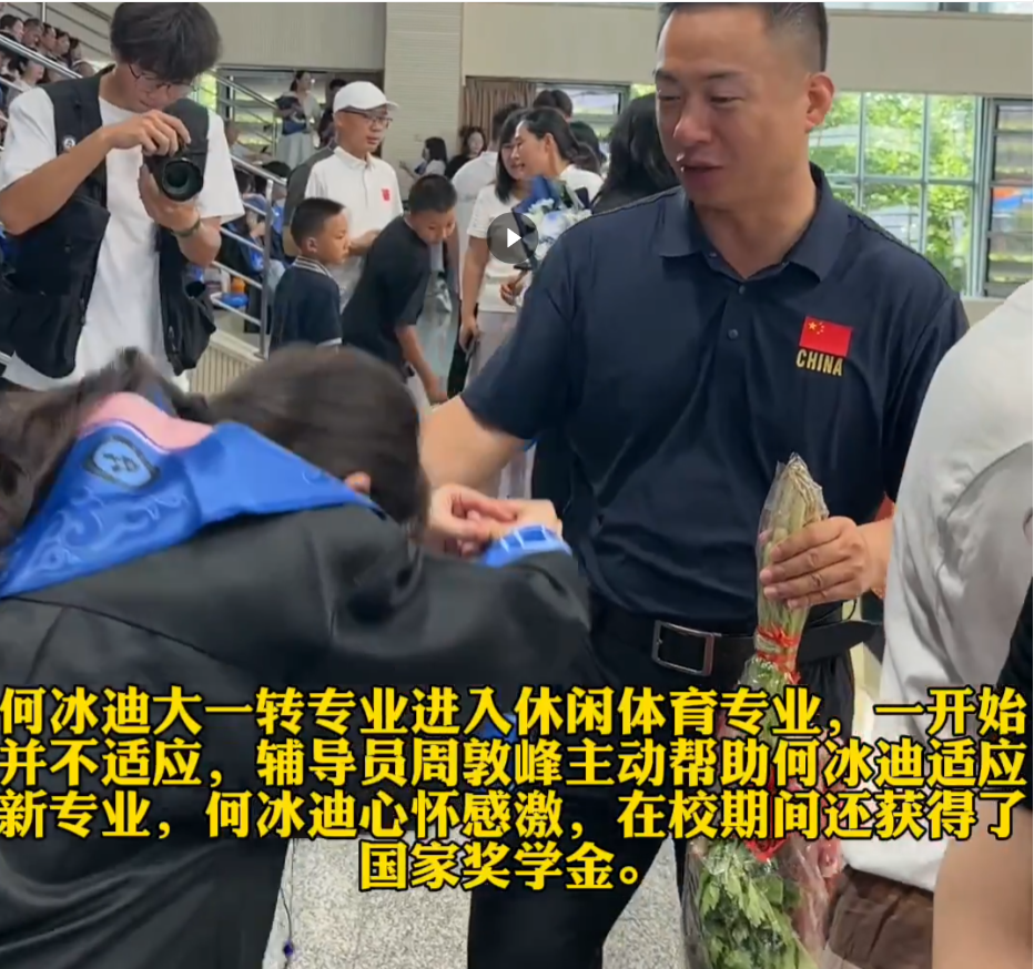据了解,何冰迪在大一转专业进入休闲体育专业学习,刚转专业的何冰迪面对新专业有点不适应,辅导员周敦峰主动帮助何冰迪适应新的专业,何冰迪在校期间还获得了国家奖学金。“太惊喜了,这应该是当老师最高光的时刻!”周敦峰说。(湖北日报全媒记者田佩雯 通讯员范玉超)