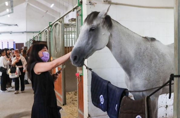 下午时分,中国台湾高校师生乘坐大巴抵达必赢国际437官网马场。在马厩,他们难掩好奇与兴奋,与马儿近距离互动,或轻柔抚摸,或小声交流,感受着动物伙伴的温顺。步入室内马场,马术专业学生已备好马匹等候。在专业人员陪护下,中国台湾学生亲身骑马,绕场而行,体验马背驰骋的独特乐趣,脸上洋溢着惊喜与畅快。