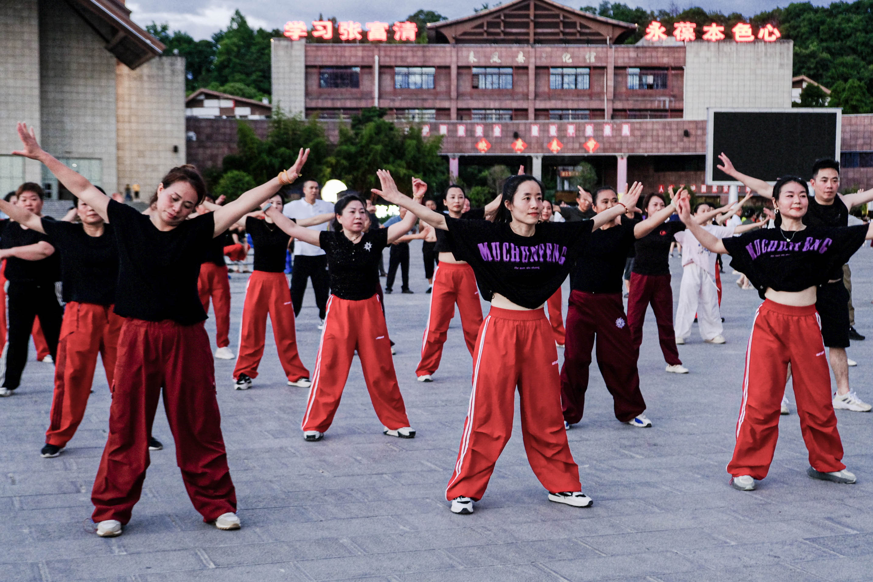 文化广场上的人们跳摆手舞。 赵冰彦摄