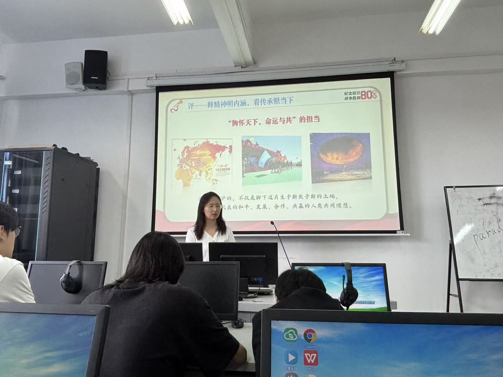 宣讲中,老师们分别从不同角度切入,让厚重历史与时代精神同频共振。陈翠翠老师以时间为轴,精准解析抗战历史时长调整的重要意义与关键节点,通过杨靖宇烈士宁死不屈的英雄事迹、731部队反人类暴行的惨痛史实,以及淞沪会战、台儿庄大捷、百团大战等经典战役,清晰阐明国共两党在抗战中的历史贡献与中国战场在世界反法西斯战争中的重要地位;张静婷老师鼓励学生先行分享观看九三阅兵的感受,然后从“历史脉络梳理”“精神内涵解读”“时代价值践行”三个维度,全面回顾了14年抗战的艰辛历程,鼓励学生们将抗战精神转化为勤学笃行的动力,以实际行动担当时代使命;蒋文汇老师聚焦青年使命,结合信息学科专业特色,强调“技术报国”的重要性;徐一鑫老师以“民族信念”为切入点,系统梳理抗战时期的战略演变,深刻阐释中国共产党在抗战中的卓越功绩,从“捍卫民族独立”“推动世界反法西斯进程”“奠定民族复兴基础”三个层面解析抗战胜利的重大意义。