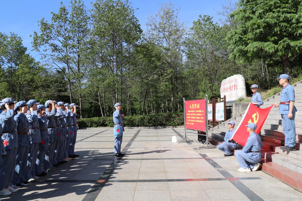 在学校党委书记王斌的领誓下,全体学员面对党旗,举起右拳,在“彝海结盟纪念碑”前庄严重温入党誓词。