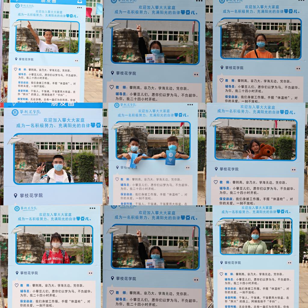 “朋友圈”留言框下,教师、辅导员、保安叔叔、食堂、宿管阿姨的寄语,是四年陪伴的新开始,“我和攀大有张合影”开始了新攀豆儿们的自律新征程。