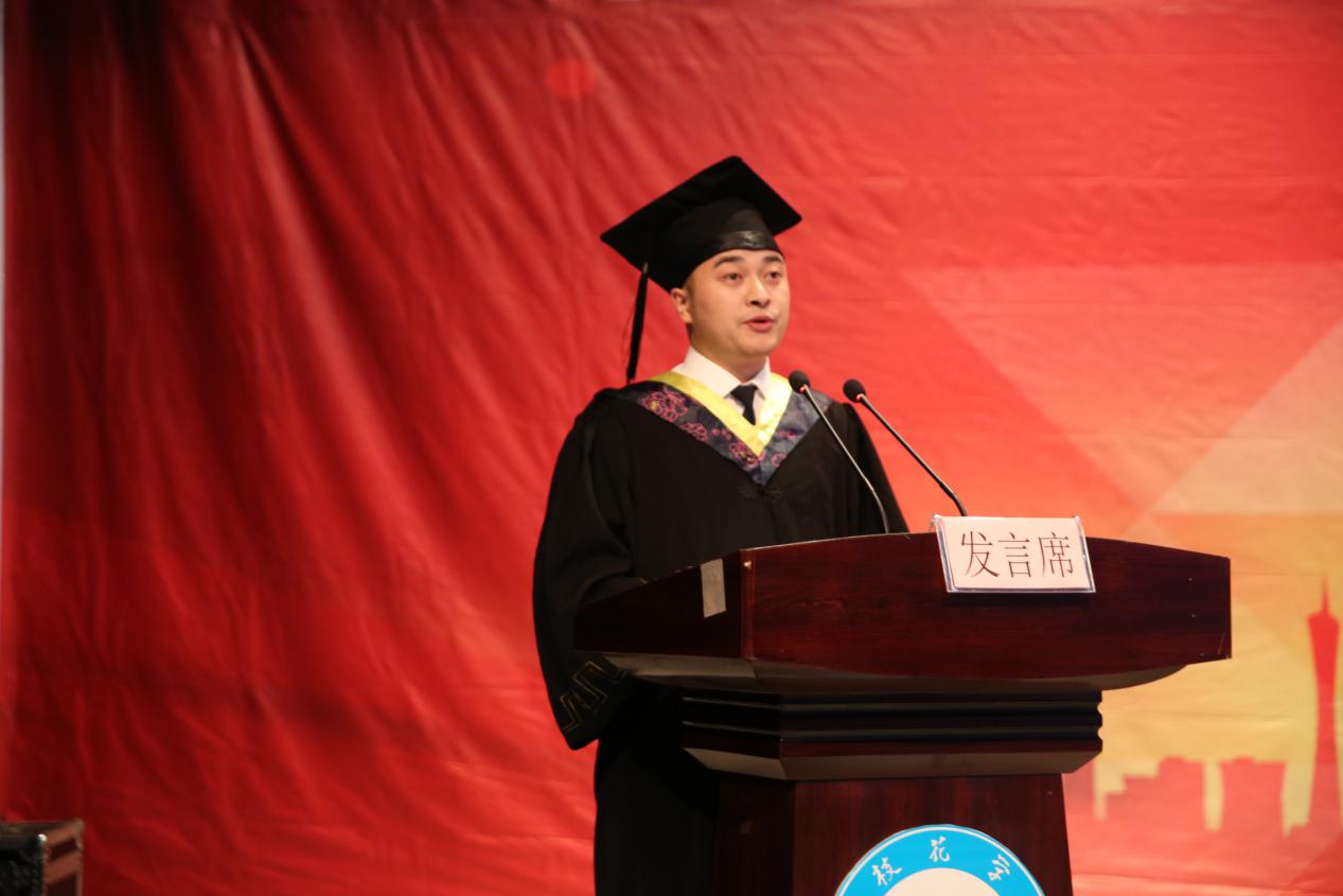 土建学院学生代表杨运超发言。他回顾了自己大学生活的点点滴滴,并希望同学们能够坚守人生目标,砥砺前行。