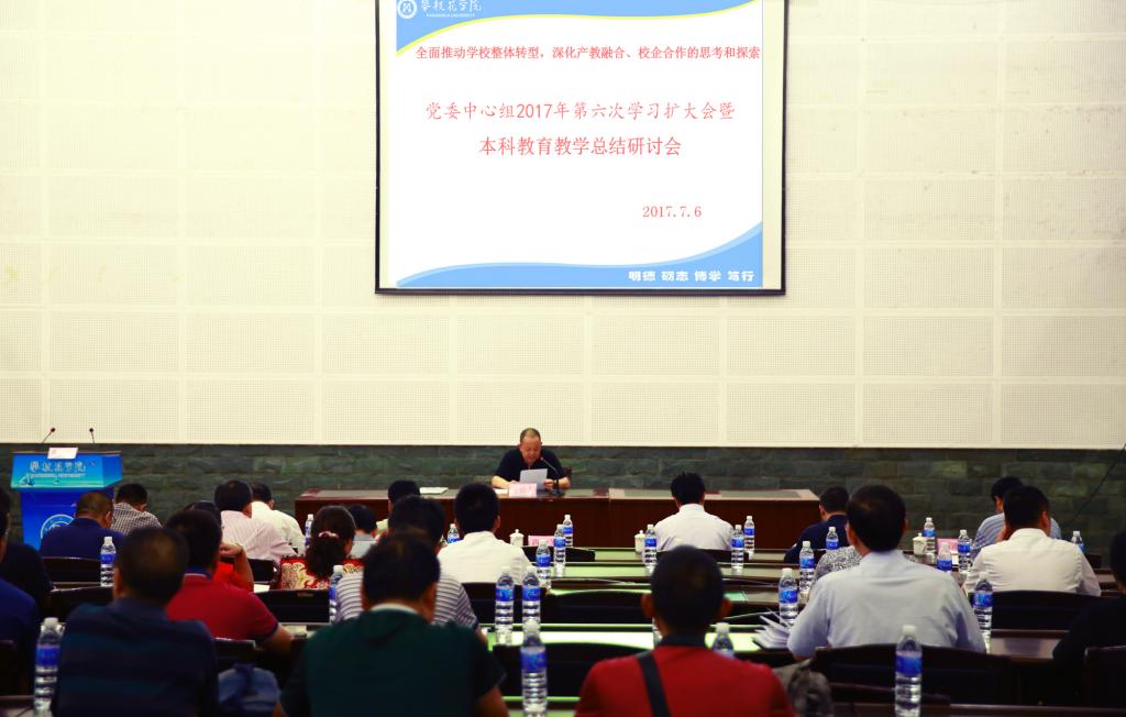 7月7日上午,beat365在图书馆学术报告厅召开主题为“全面推进学校整体转型,深化产教融合、校企合作的思考和探索”的党委中心组2017年第六次学习扩大会暨本科教育教学总结研讨会。校党委书记肖立军主持会议。