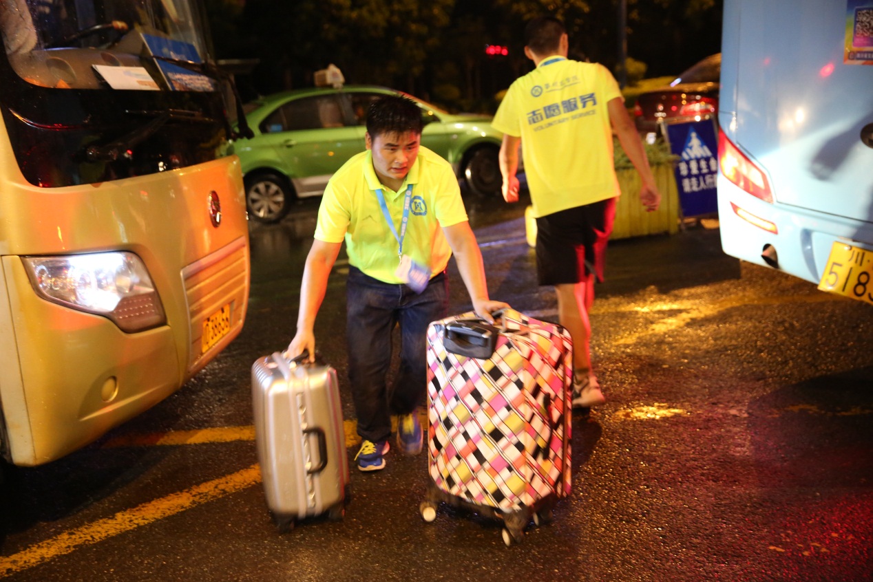 风雨击打着车窗,校车终于安全抵达了学校。突降的暴雨给迎新工作带来了巨大的困难,等待在路边的志愿者们,哪里顾得上衣服会不会湿,哪里顾得上已经工作到半夜了,干脆脱掉了一层薄薄的雨衣,冒雨而行,帮助搬运行李,顺着头发滴下的,早已分不清是雨水还是汗水。