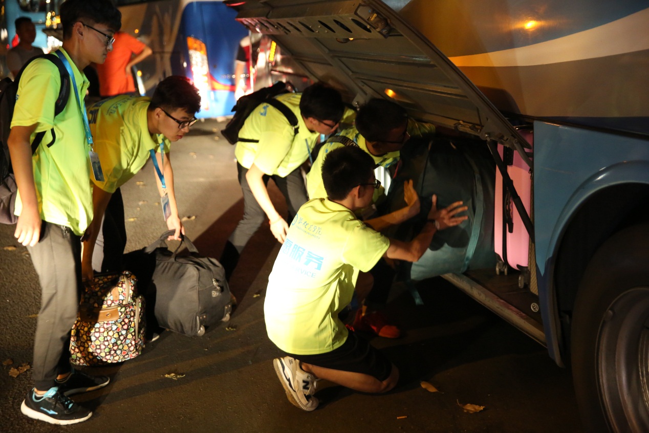 深夜,又一批新生走到了出站口,学校的守望者们把手里的牌子举得更高,呼喊着学校的名字,接过一件又一件行李,把求学异乡的他们送上开往“新家”的校车,远远地看它驶离。