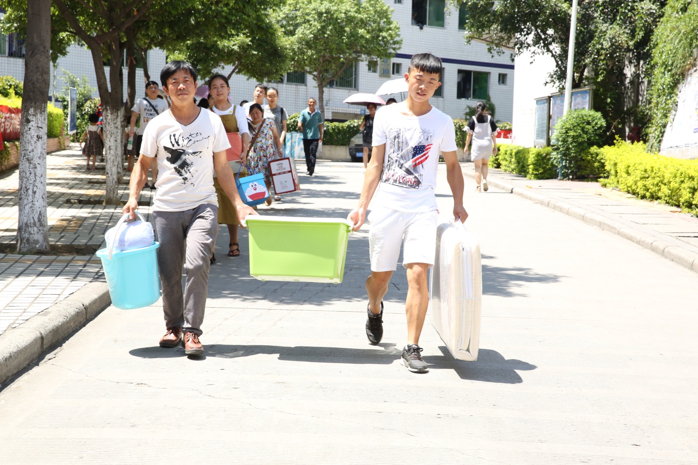 烈日灼烤下,新生报到工作有条不紊地进行着。家长为孩子置备生活用品、搬运行李的身影在校园中随处可见。10号楼前,一对父子走在路上,父亲眼里满是对孩子的不舍,三言两语的叮嘱透露出深深的父爱。
