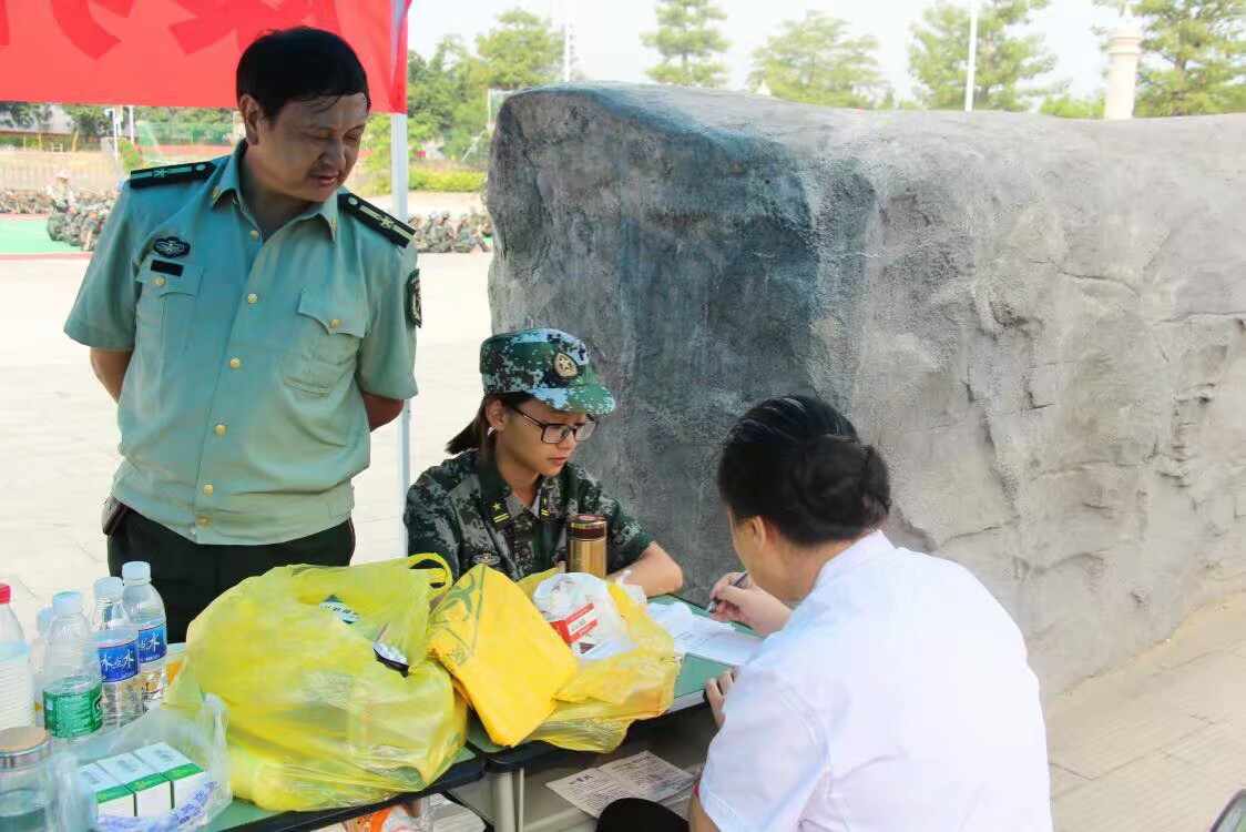 面对军训时多变的天气状况,为了及时有效地应对突发状况,学校二级学院分管学生工作的领导,2017级新生辅导员,医生,以及在场学生志愿者,为军训教官和学生提供了强有力的后勤保障。