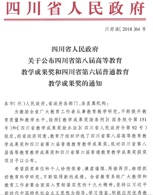 据悉,四川省高等教育教学成果奖代表了全省教学成果的最高水平,此次评选,共评出省级教学成果奖380项,其中一等奖100项,二等奖120项,三等奖160项。