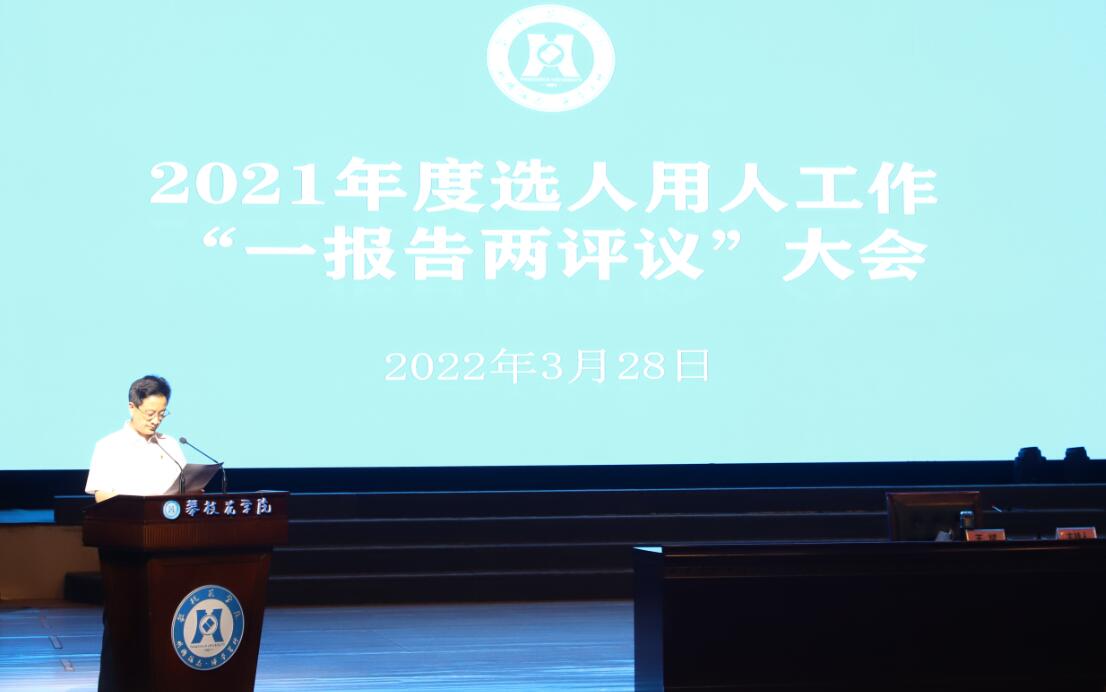 王斌代表学校党委做2021年度选人用人工作情况报告。他介绍了上一年度“一报告两评议”反映问题和省第十一次党代会以来选人用人专项检查发现问题的整改情况,重点就2021年度学校党委干部选拔任用工作基本情况、主要做法、存在的主要问题和下一步工作方向做了汇报。2021年,学校以习近平新时代中国特色社会主义思想为指导,深入贯彻落实习近平总书记关于干部工作的讲话精神,紧紧围绕学校中心工作和事业发展目标,进一步深化干部人事制度改革,努力提高干部选拔任用工作的整体水平,不断加强处级领导班子和干部队伍建设。学校党委始终围绕中心大局选干部配班子聚人才,着力打造忠诚干净担当的高素质干部队伍,为推动学校高质量发展提供坚强组织保证。