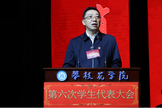 胥刚对大会的召开表示祝贺,他肯定了自第五次学代会召开以来学生会工作所取得的成绩:一是将广大同学更加紧密地团结凝聚在党的周围;二是有效服务了广大同学成长成才和全面发展;三是健全和完善了权益保障机制;四是加强了“网上学生会”建设;五是全面推进学校学生会组织改革。胥刚对学生会接下来的工作提出了三点意见:一是把握正确政治方向,将广大同学最广泛最紧密地团结和凝聚在党的周围;二是坚持服务同学宗旨,引导广大同学努力成长为德智体美劳全面发展的中国特色社会主义建设者和接班人;三是加强自身组织建设,增强学生会组织的政治性、先进性、群众性,做自律攀大人的典范和表率。最后,胥刚对广大学生代表提出以下希望:希望大家在学校党委的坚强领导下,在学校学工部、团委的具体指导下,认真履职尽责、甘于无私奉献、坚持带头示范、始终任劳任怨,要以“永远要坐第一排”的勇气做出“第一等的工作”,更好团结和凝聚广大同学为学校建设应用型一流大学贡献青春力量!在火热的青春中放飞人生梦想,在奋斗的青春中成就事业华章!