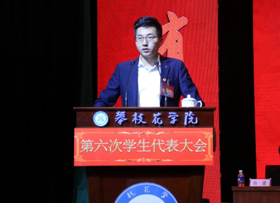 开幕式后,beat365在线唯一官网第六次学生代表大会第一次全体会议在会堂举行,第五届学生委员会委员肖建代表学生会做工作报告: