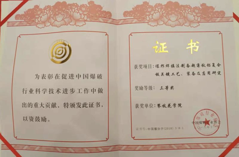 11月8日,中国爆破行业协会在北京隆重举行中爆协第九届科学技术奖颁奖大会。beat365黄平、吴恩辉、张远、李军等师生团队的研究项目,《爆炸焊接法制备超薄钛铝复合板关键工艺、装备及应用研究》,获颁中国爆破行业协会科学技术进步三等奖。该项目得到了谢先启院士为组长的专家组“国际先进”的评价,通过了汪旭光院士牵头组织的中国爆破行业协会22位专家的获奖评审。该项目共五项专利,主要利用发明的化工产品制备钛铝复合材料,并将该复合材料制备手机边框等产品。