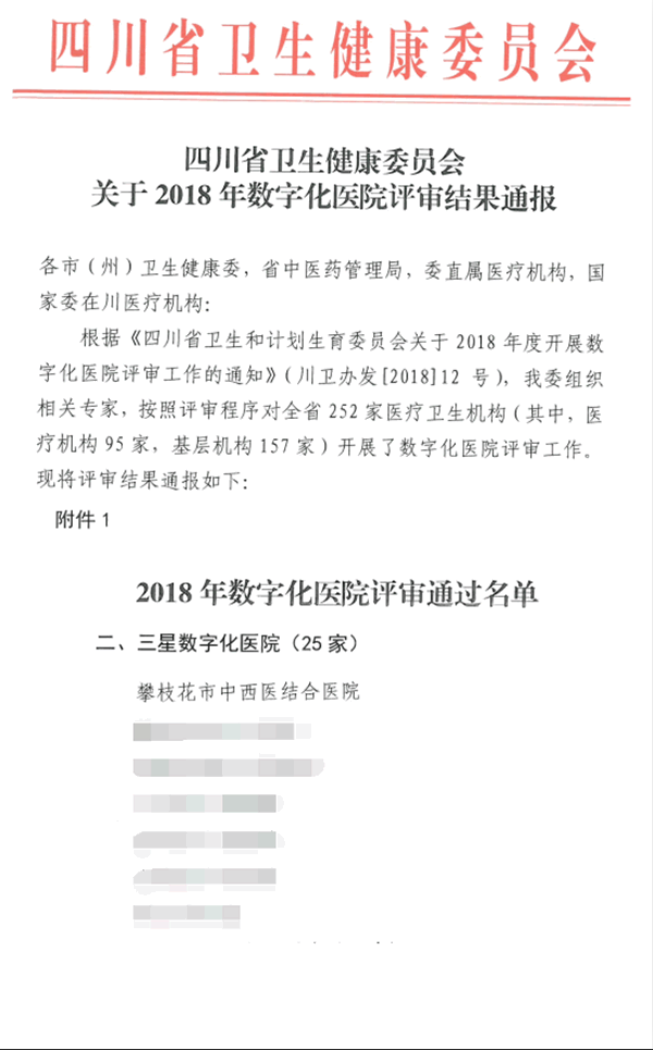 近日,在四川省卫生健康委关于《2018年度数字化医院评审结果》的通报中,beat365附属医院被评为三星数字化医院,这是继被省卫健委评为“发挥信息优势”示范医院、中国管理全球论坛“互联网+医疗健康最佳建设奖”之后,附属医院在信息建设领域上的又一殊荣。