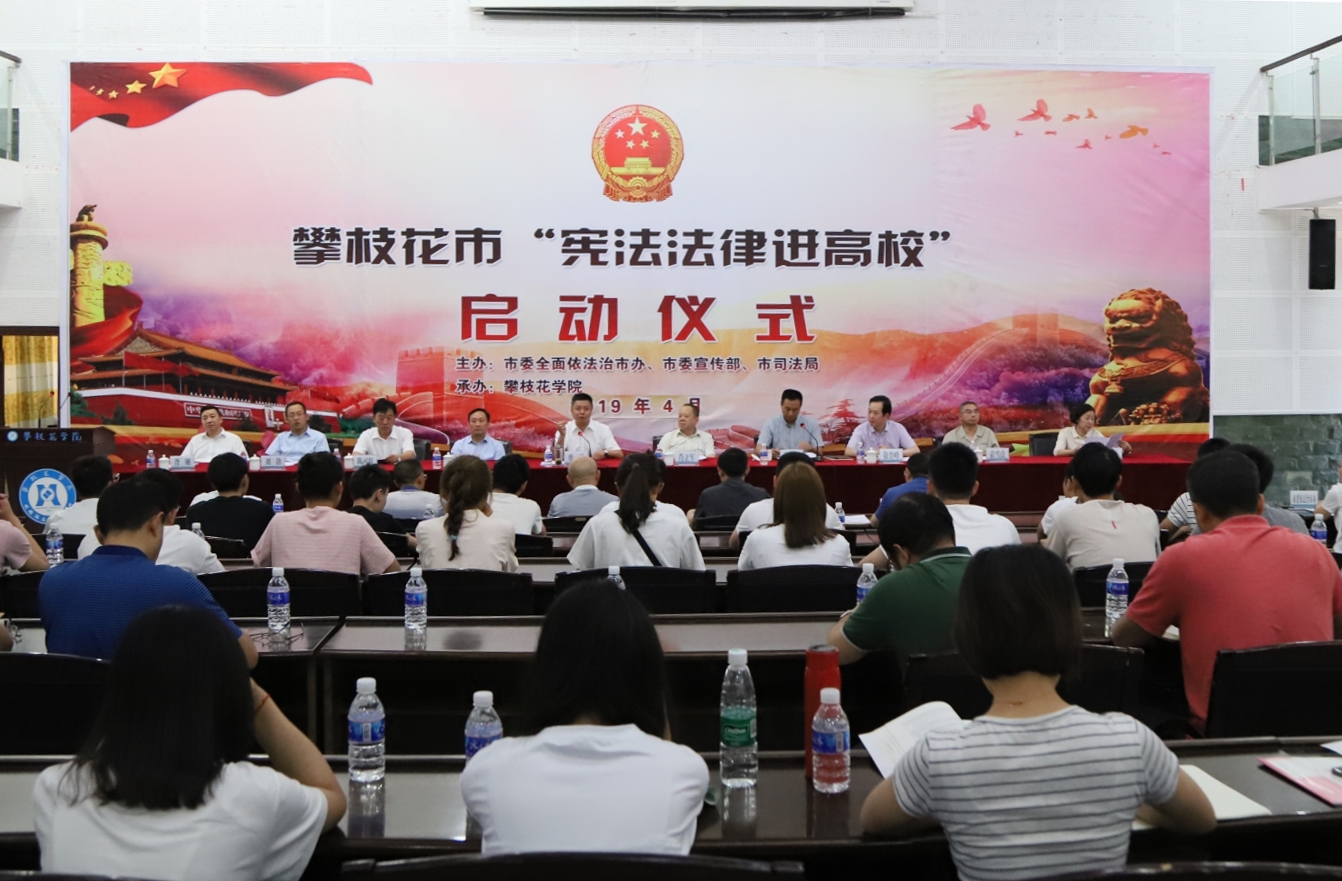 4月24日下午,攀枝花市“宪法法律进高校”启动仪式在beat365学术报告厅顺利举行。市委副书记虞平、beat365党委书记肖立军、党委副书记胥刚出席仪式,市委常委、宣传部部长江海,市人大常委会副主任陈可红、市政府副市长、公安局局长敬登峰、市检察院代理检察长刘勃、四川机电职业技术学院副院长袁雪良出席仪式。市委宣传部、市司法局、市教体局相关负责人,以及beat365和四川机电职业技术学院师生代表近200人参加仪式。