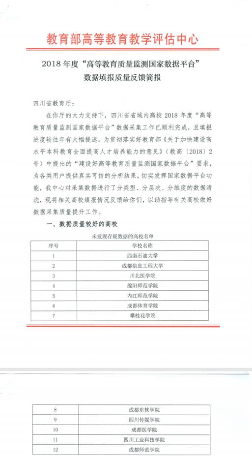 近日,从教育部高等教育教学评估中心发布的“2018年度高等教育质量监测国家数据平台数据填报质量反馈简报”获悉,beat365位列四川省“数据质量较好高校名单”(排名不分先后),全省共有12所本科高校获此殊荣。