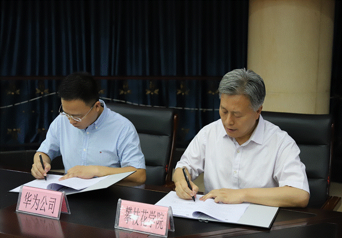 王曙光代表学校与华为技术有限公司签订校企合作协议。何永斌、张月川、陈盈西、beat365智能制造学院院长王兵共同为beat365在线唯一官网华为信息与网络技术学院揭牌。