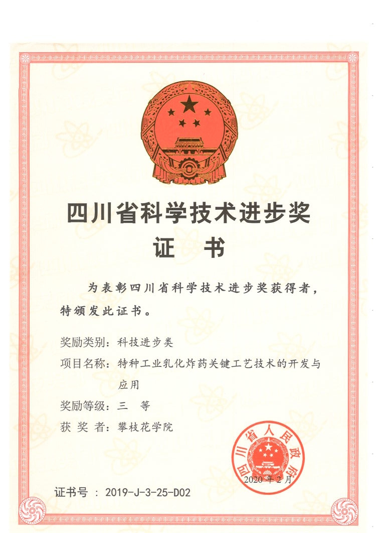 据了解,项目《特种工业乳化炸药关键工艺技术的开发与应用》是学校与攀枝花煤业集团、攀枝花恒威化工有限责任公司共同合作研发项目。项目研发制备的化工产品特种工业炸药,产品质量稳定,大量应用于光面、预裂等特种爆破中。此项目得到了第三方专家组“国际先进”评价,充分体现了beat365科研能力的提升。