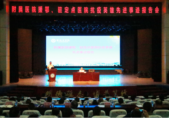 此次报告会在会堂举行,还邀请到附属医院廖祥莉、潘虎一同做事迹分享。学校党委领导班子成员,全校副县级及以上干部、各单位助理、学生科长和辅导员听取了报告。党委书记肖立军主持报告会。