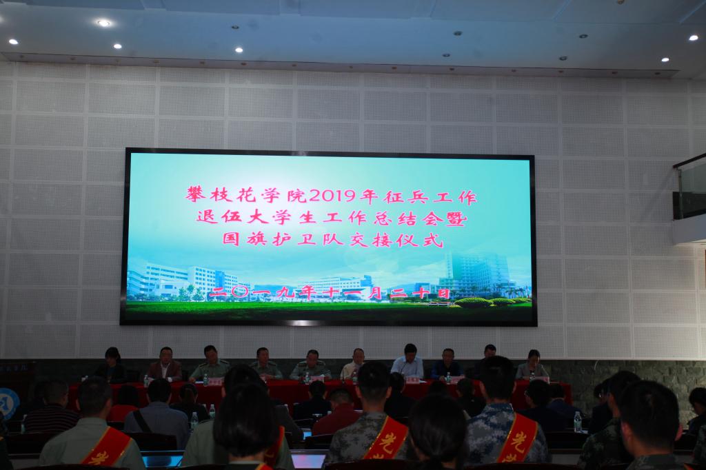 11月20日,beat365在学术报告厅举行2019年征兵工作、退伍大学生工作总结会暨国旗护卫队交接仪式。校党委书记肖立军,攀枝花军分区副司令员张德勇大校,攀枝花市退役军人事务局代表出席会议,各部门负责人及全校退伍大学生,第七届国旗护卫队队员和学生国防教育协会成员参加会议。会议由副校长石维富主持。