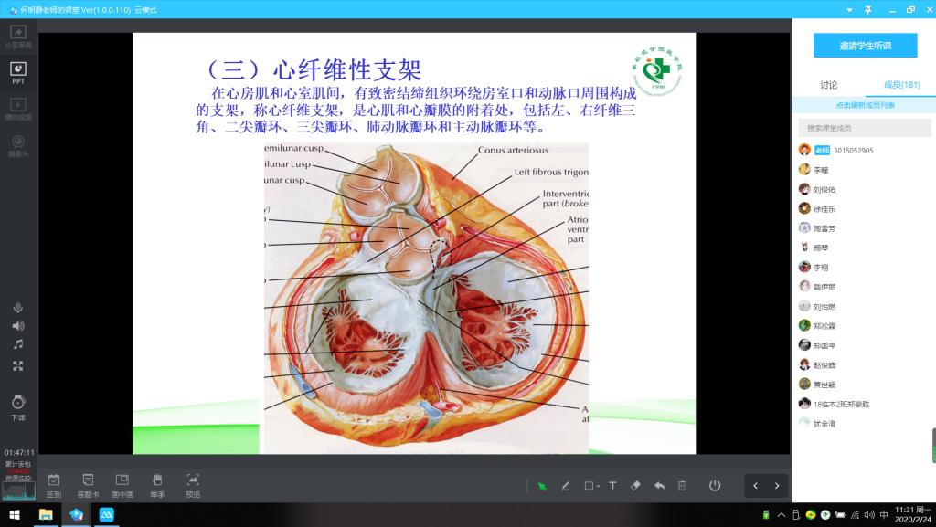 基础医学院 共开设线上学习课程18门。2月24日有两位老师,310名学生进行线上课程。老师和学生认真准备、积极对待。面对网络拥堵,老师能够充分发挥主观能动性,采取微信群、QQ群、腾讯课堂等多平台、多形式教学。其中,《心血管系统疾病》课程,任课教师提前建立云班课和云教材,提前一周学生加入云班课学习教材、PPT、视频及测试。该课程通过腾讯课堂开展线上教学,共183名学生上课,到课率100%。《预防医学》任课教师通过云班课教学,采用线上自学+线上辅导方式进行,要求学生提前先预习,老师线上讲解要点和重点开展课堂讨论答疑和测试。