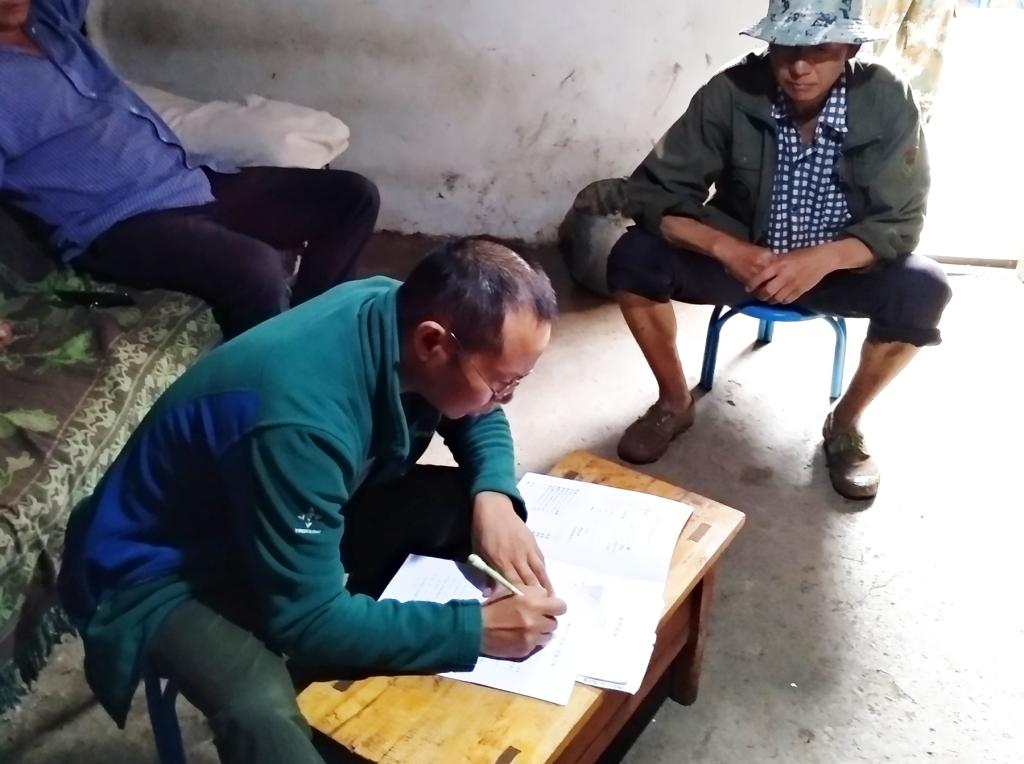 由于长期高强度的工作,走村入户,上坡下坎,再加上鸡毛店村海拔较高,刘忠良身体出现了不适应。2018年12月起,刘忠良的双脚膝盖就时时隐隐作痛,上坡下坡时行动困难,到2019年3月,病情加重,上下楼梯时左脚完全使不上力,经门诊初步检查是膑腱炎。但由于脱贫攻坚工作正处于关键时期,刘忠良顾不上多休息就杵着登山杖回到了鸡毛店村,一直坚持到6月底参加完“两不愁三保障”大排查。在大排查的最后一天,刘忠良双膝实在痛的厉害,无法入户排查,他也闲不下来在村部整理资料。