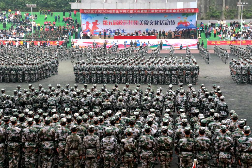 在家校领导、武警攀枝花支队领导出席大会,学校各单位党政负责人、师生、校友代表及军训教官参加军训展示。大会由党委常委、副校长刘立新主持。